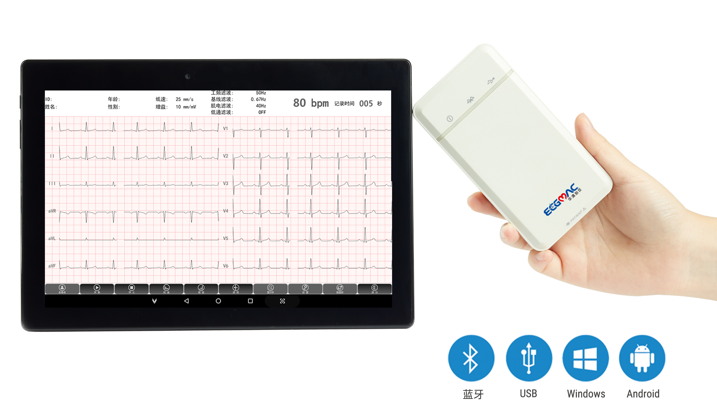 标准12导联、兼容9导联、6导联采集模式;支持windows、安卓系统